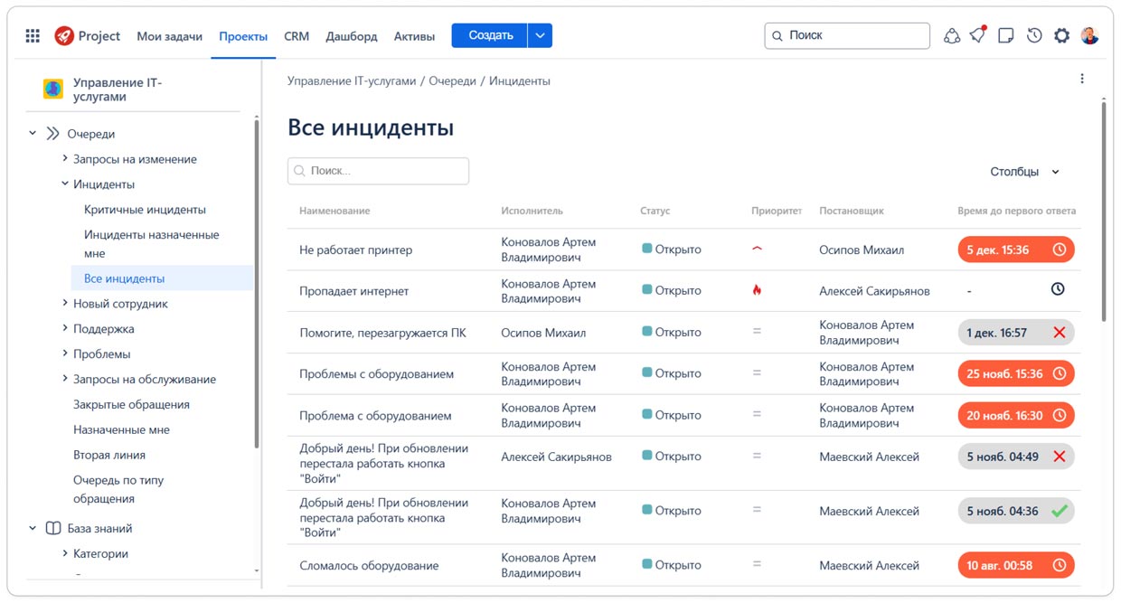 - Контроль SLA (Service Level Agreement): Мониторинг соблюдения регламентированных сроков решения задач.