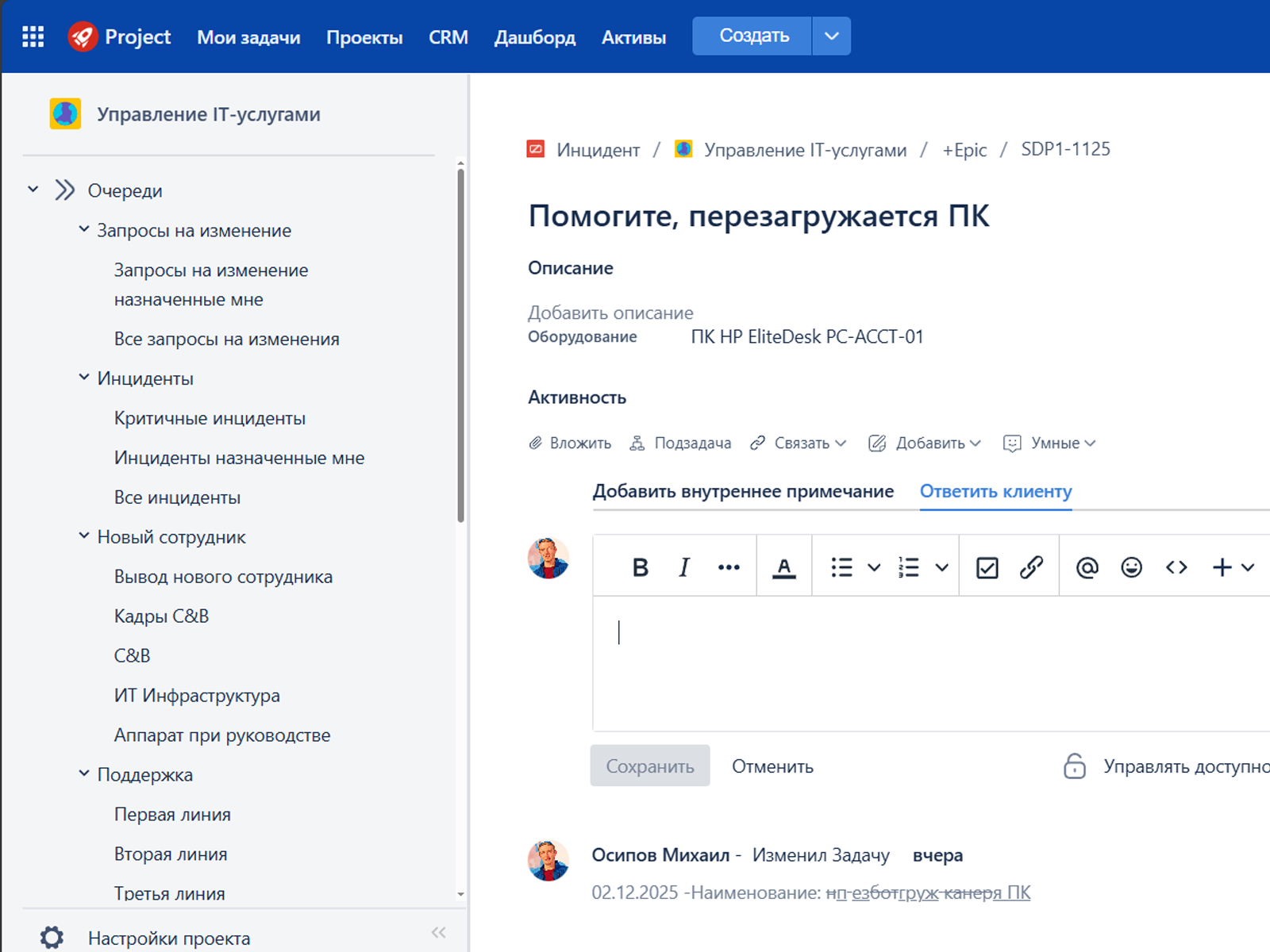 - Симбиоз заявок и активов: Инженер прямо из тикета видел конфигурацию проблемного ноутбука пользователя.