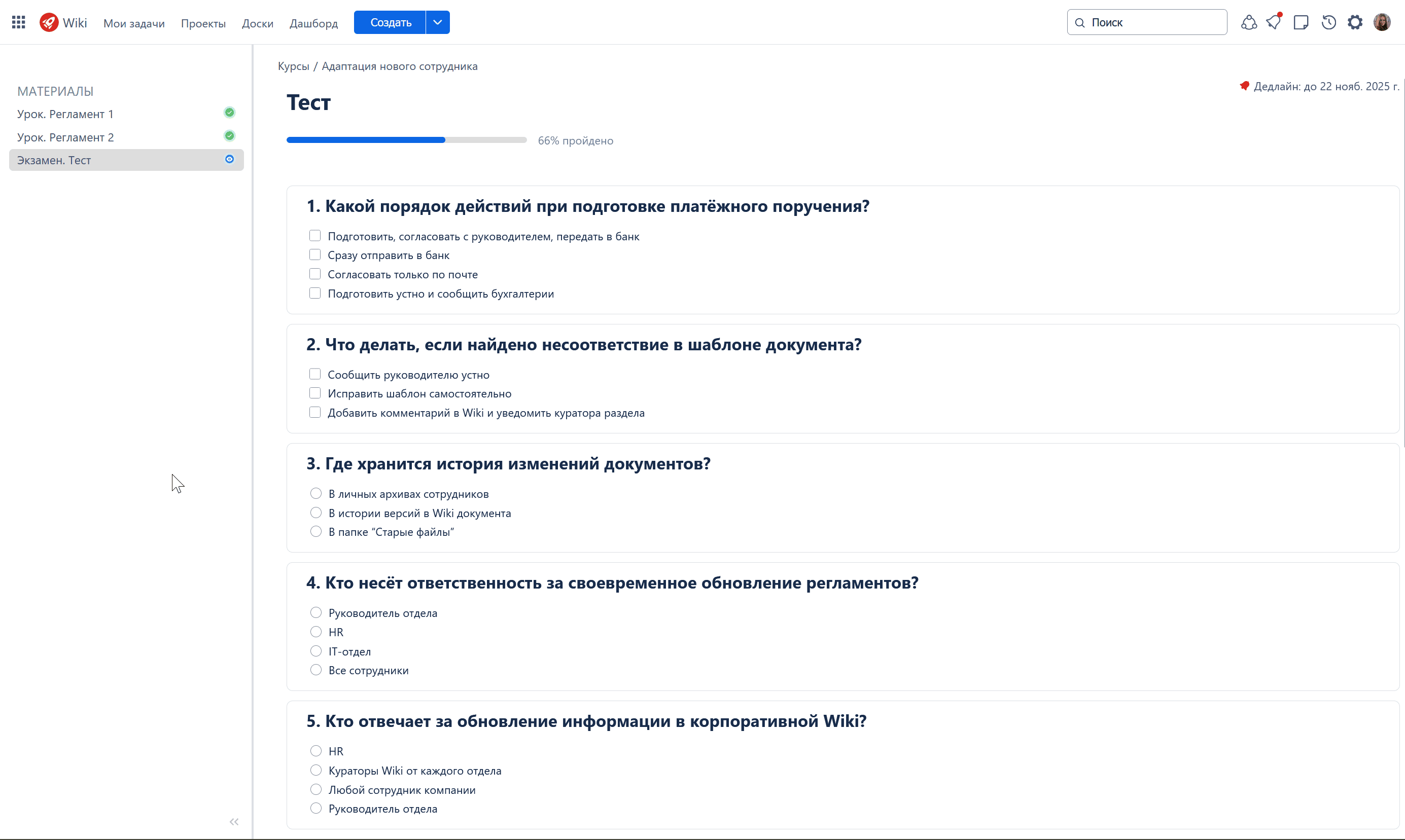 Для решения такой задачи в EvaWiki доступен модуль "Обучение". Каждый урок, это обычная Wiki-страница, но с интерактивом (видео, изображения, ссылки, тесты). Каждому новичку при приёме создаётся назначение курса — и всё происходит автоматически: он получает уведомление, проходит уроки в удобное время, сдаёт тест. После прохождения HR видит итог и не тратит ни минуты на ручную проверку.