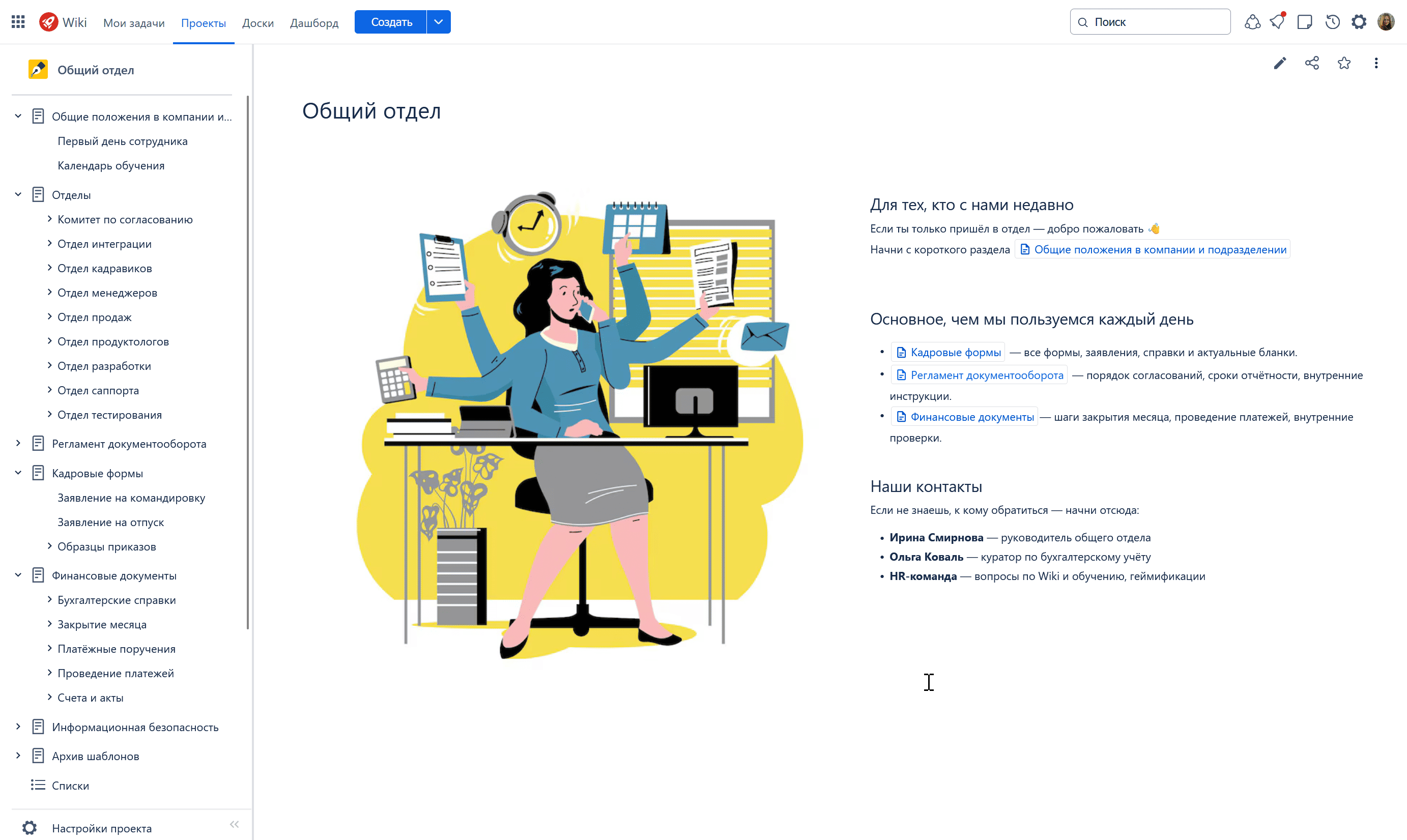 Теперь новичок заходит в Wiki и видит всё: от графика командировок до образца заявления на отпуск.
