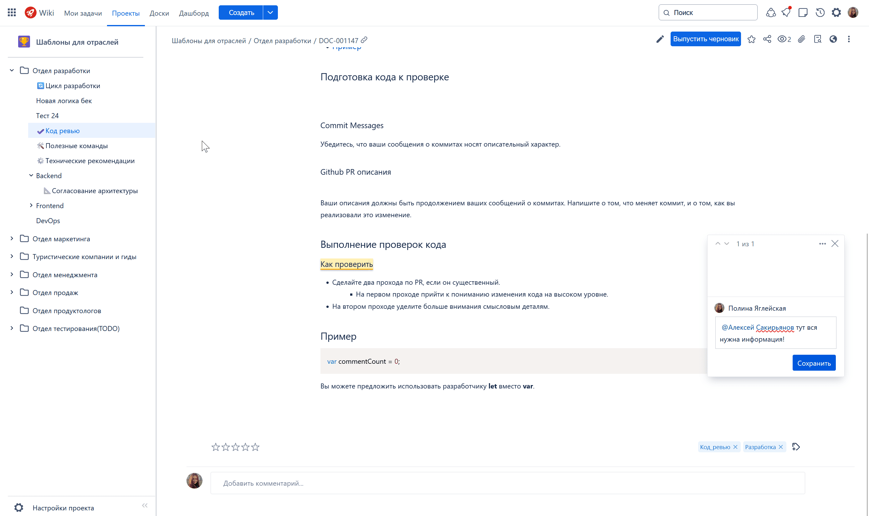 - Новичок получает доступ к живой базе знаний — не PDF-файл, а постоянно обновляемую систему (у документов есть история изменений, сравнения).