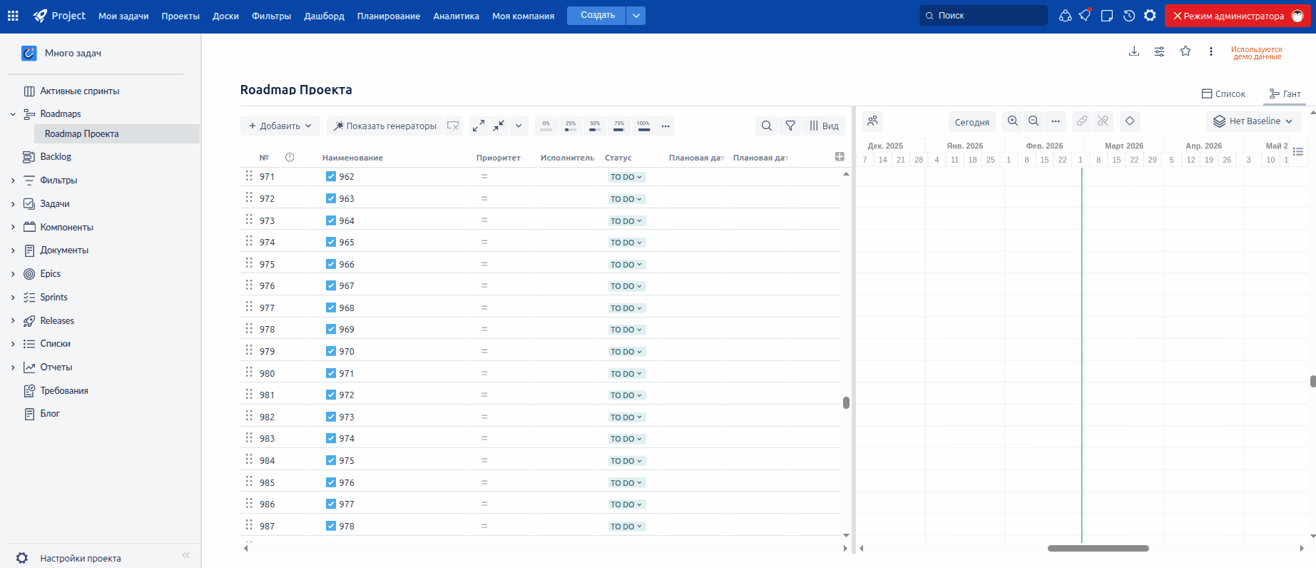 Мы комплексно переработали диаграмму Ганта: были оптимизированы загрузка и отрисовка данных. Работа с интерфейсом стала более плавной, а количество отображаемых задач теперь почти не ограничено. Дополнительно доработаны механизмы сортировки, раскрытия и сворачивания задач.