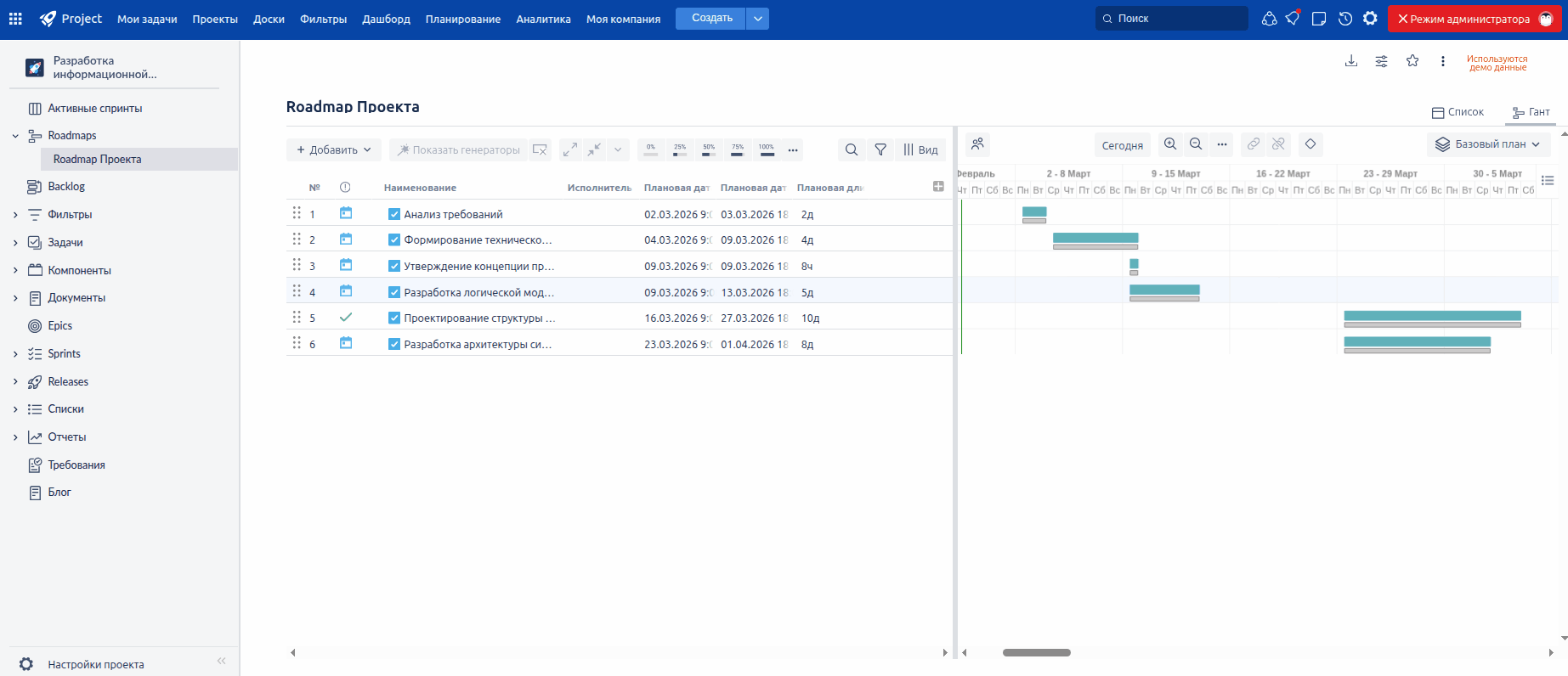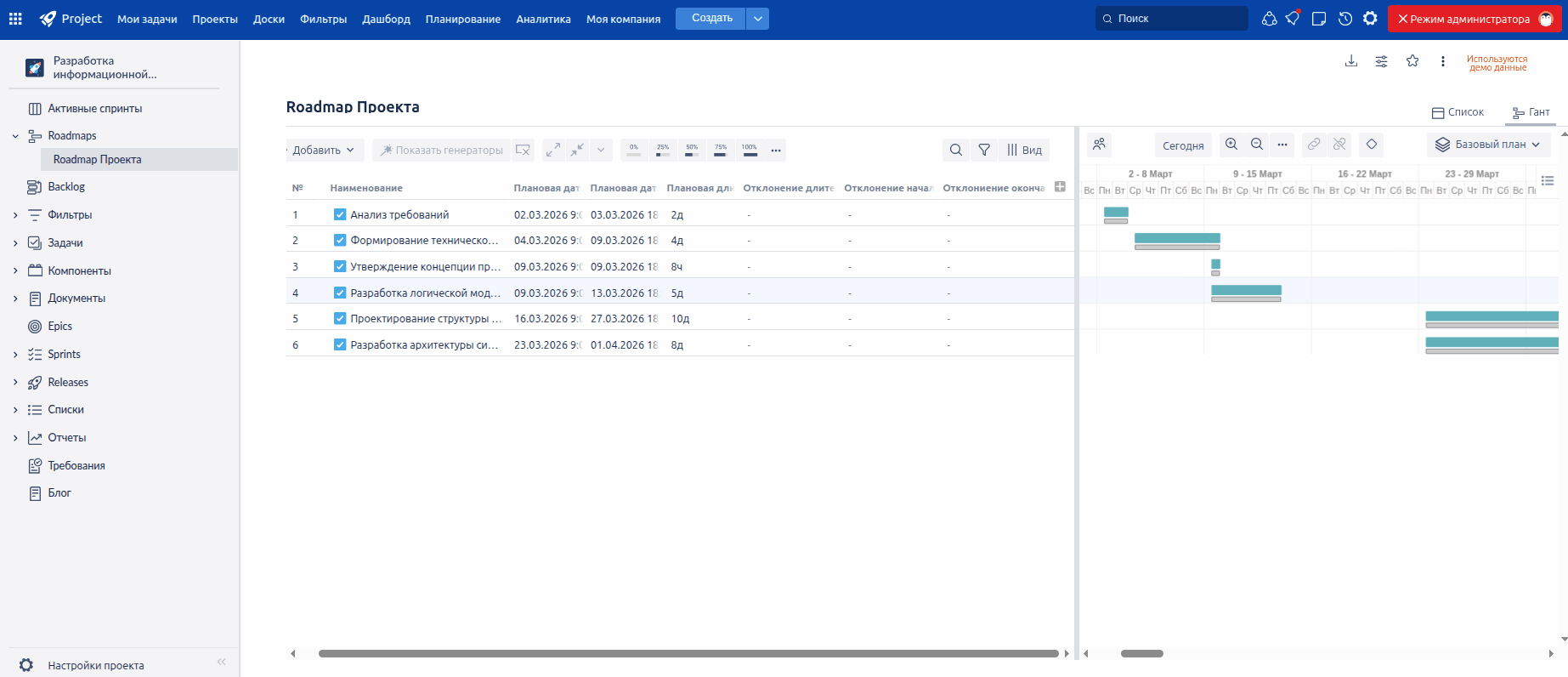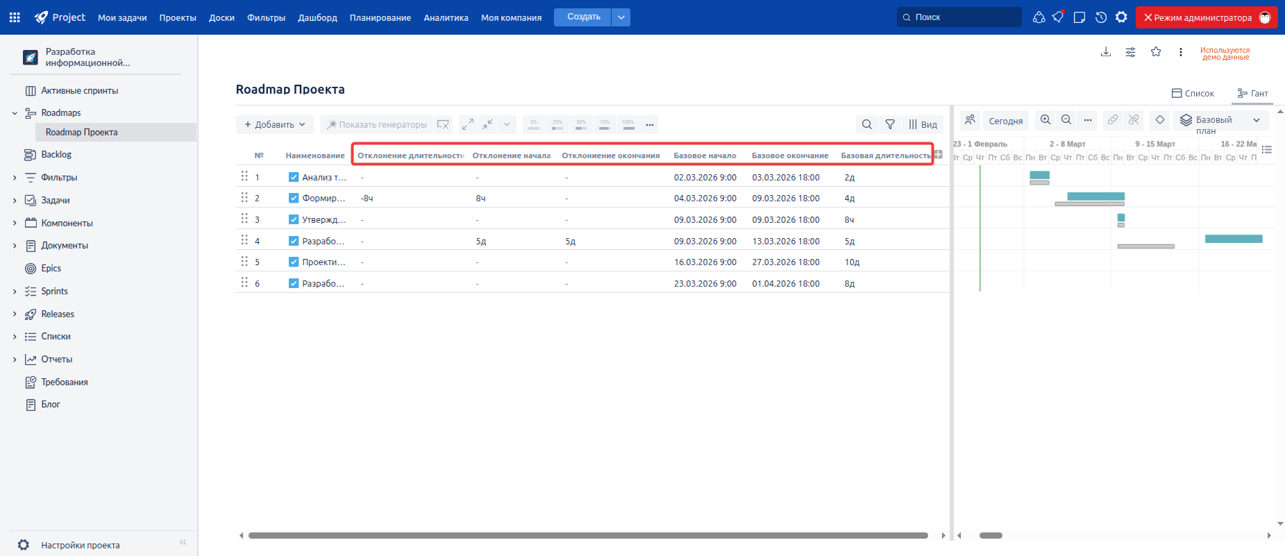 Глобально переработана логика работы с отклонениями от Базового плана (Baseline). Система автоматически рассчитывает отклонения от выбранного активного базового плана при изменении плановых дат или длительности задач и фиксирует результаты в новых полях. Это позволяет руководителям и проектным командам в режиме реального времени видеть отклонения от утвержденного плана и быстро реагировать на них, снижая риск срыва ключевых этапов проекта — без необходимости написания дополнительных автоматизаций.