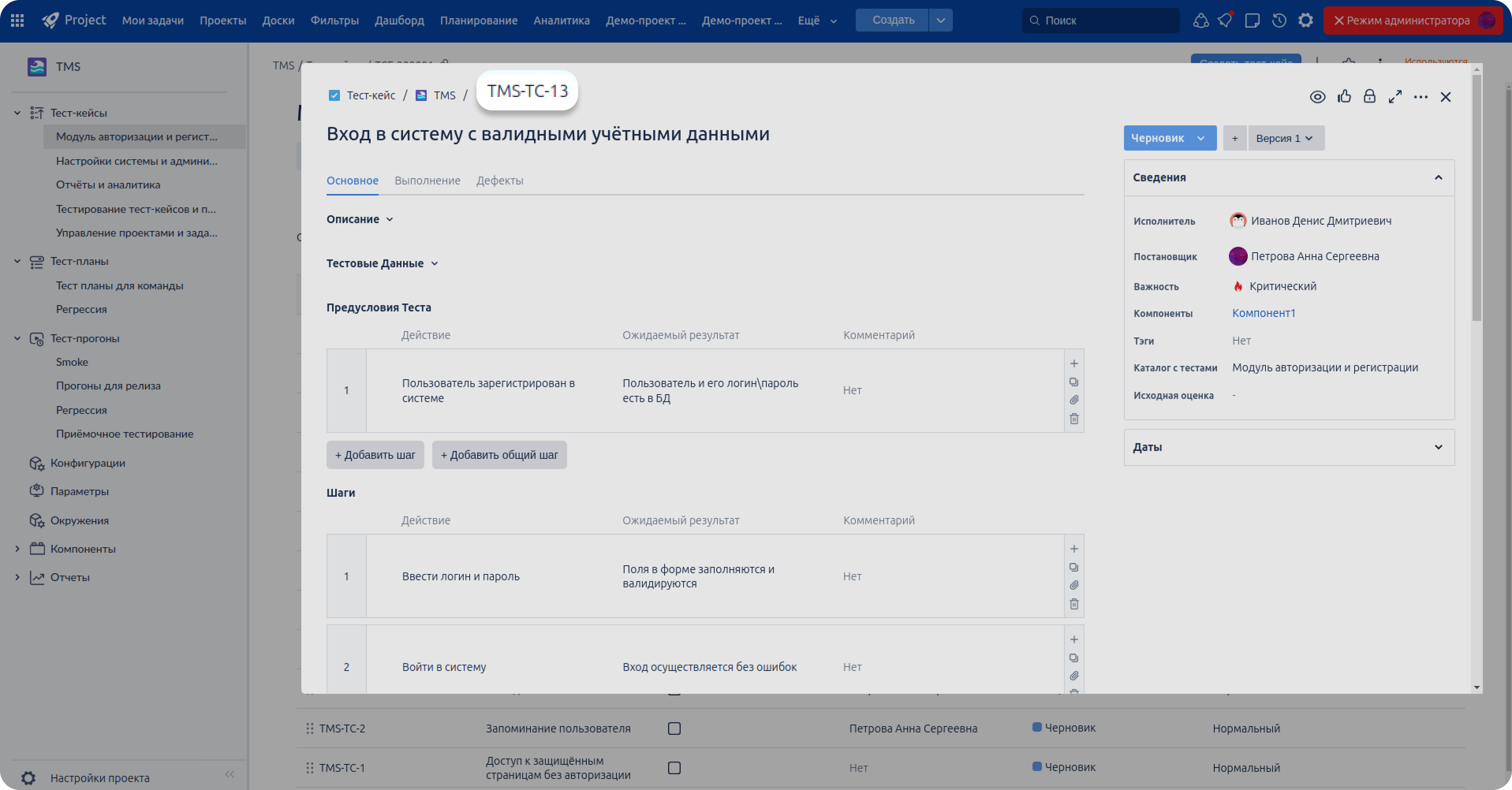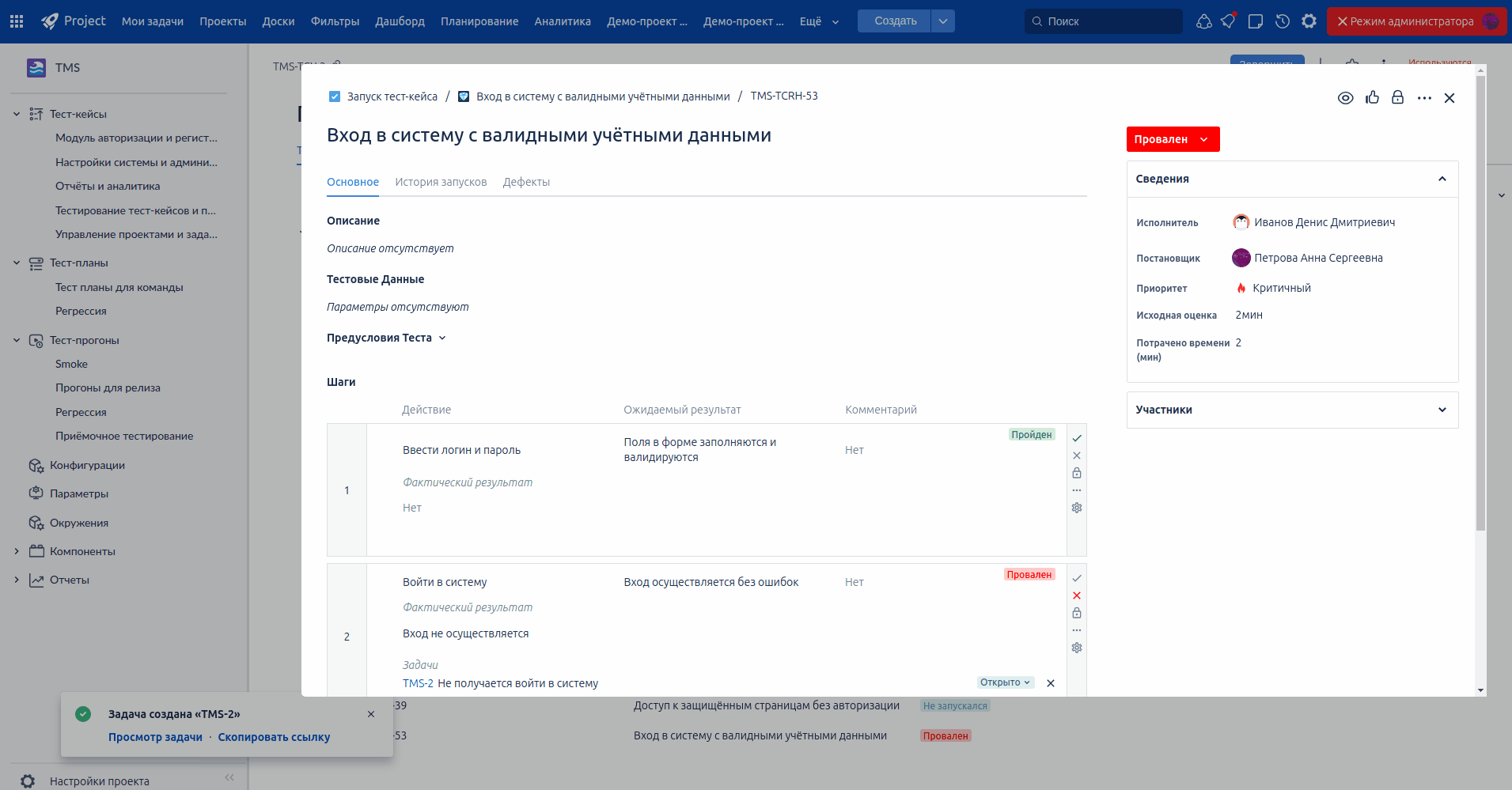 Реализована двусторонняя связь между задачей и конкретным результатом прогона теста, включая шаг тест-кейса. Теперь из задачи можно увидеть, к какому тест-кейсу, прогону и тест-плану она относится, а из результатов тестирования — быстро перейти к связанному дефекту. Это повышает прозрачность тестирования, упрощает анализ проблем и делает управление качеством более контролируемым.
