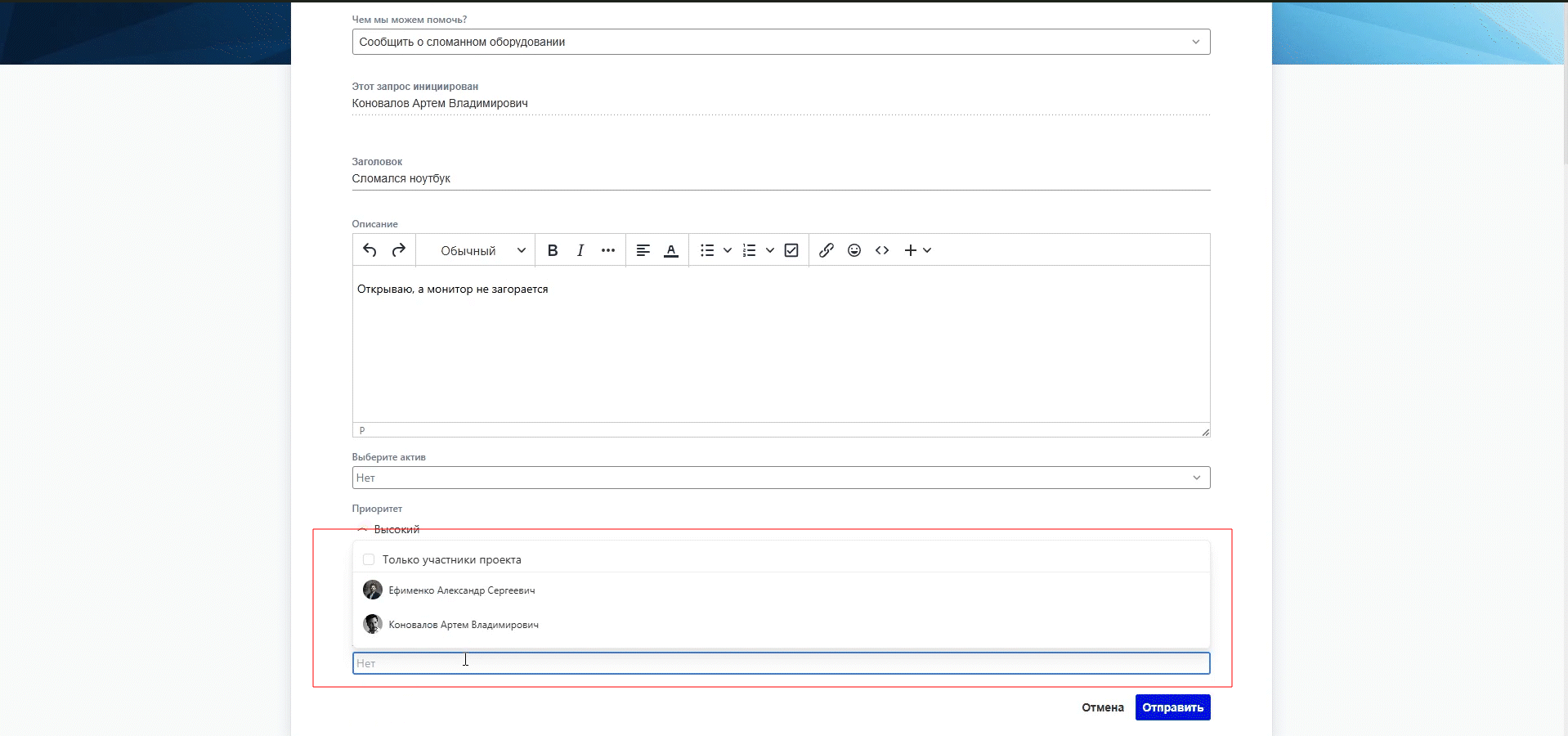 На портале самообслуживания появилась функциональность «Ассистент постановщика». Теперь к заявке можно привязать одного или нескольких ассистентов — коллег, которые не только видят заявку, но и могут менять её статус, например подтверждать закрытие или возвращать в работу. Это удобно, когда заявку создает один сотрудник, а контролирует её выполнение другой: помощник оформляет, руководитель проверяет и закрывает.