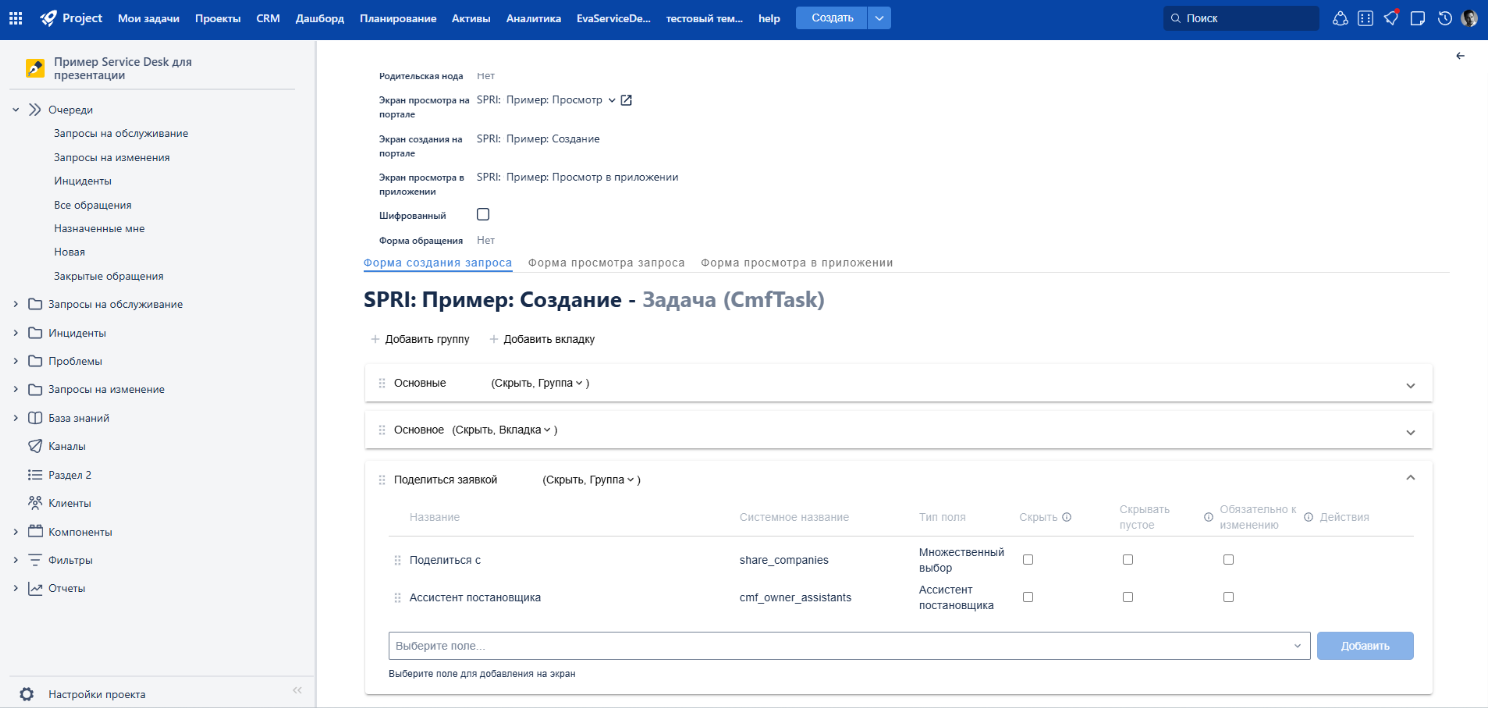 Управлять отображением шеринга легко: достаточно перетащить нужные поля в конструкторе типа запроса. Можно вывести обе функции в любом порядке, оставить только одну или полностью отключить шеринг для конкретных заявок.