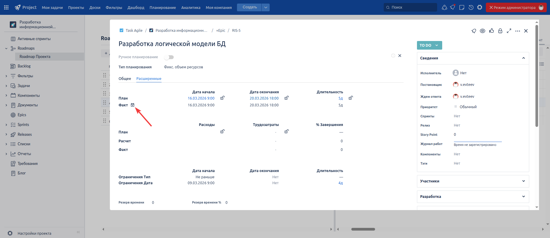 В этом релизе добавлена новая опция «Передавать факт в план» в разделе «План» задачи, предназначенная для команд, работающих на основе утвержденного базового плана и контролирующих отклонения в режиме реального времени. Данный режим работы предназначен для тех, кто основывается в работе на утвержденный базовый план и в режиме онлайн хочет оценивать отклонения по задачам от зафиксированных значений в активном базовом плане. При активной опции, любые изменения фактических дат или длительности автоматически переносятся в плановые значения, после чего система сразу рассчитывает отклонения относительно зафиксированных показателей активного базового плана. Это позволяет синхронизировать фактическое исполнение с текущим планированием и обеспечивать прозрачный контроль расхождений без дополнительных ручных операций.