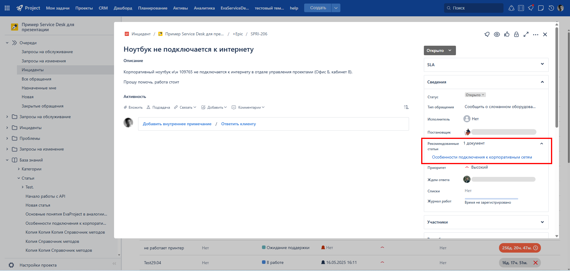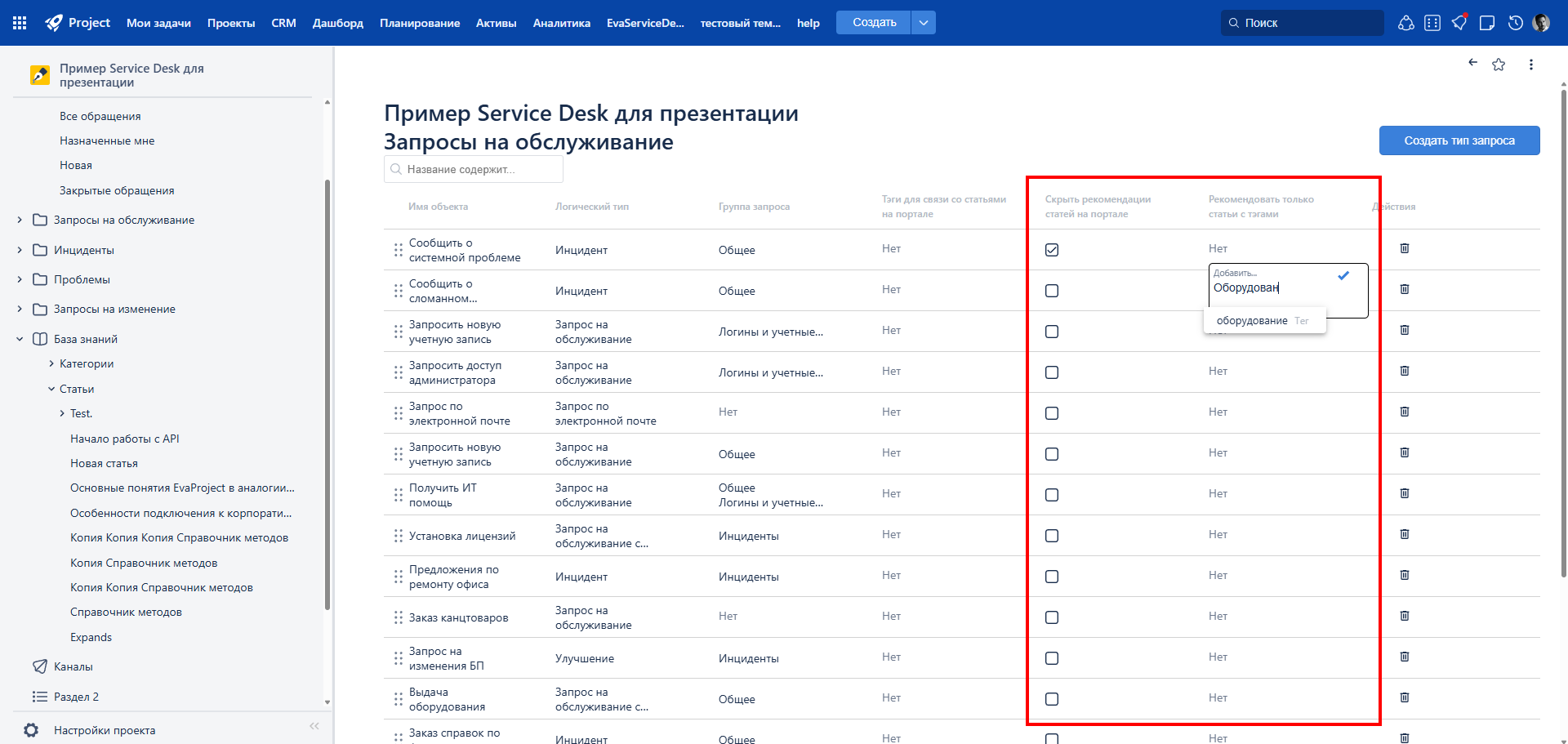 Мы расширили возможности работы с базой знаний. На портале самообслуживания для каждого типа запроса теперь можно гибко настраивать блок рекомендованных статей: включать или отключать его отображение, а также ограничить вывод материалами с определенными тегами. Это позволяет показывать пользователям только релевантные их запросу статьи.