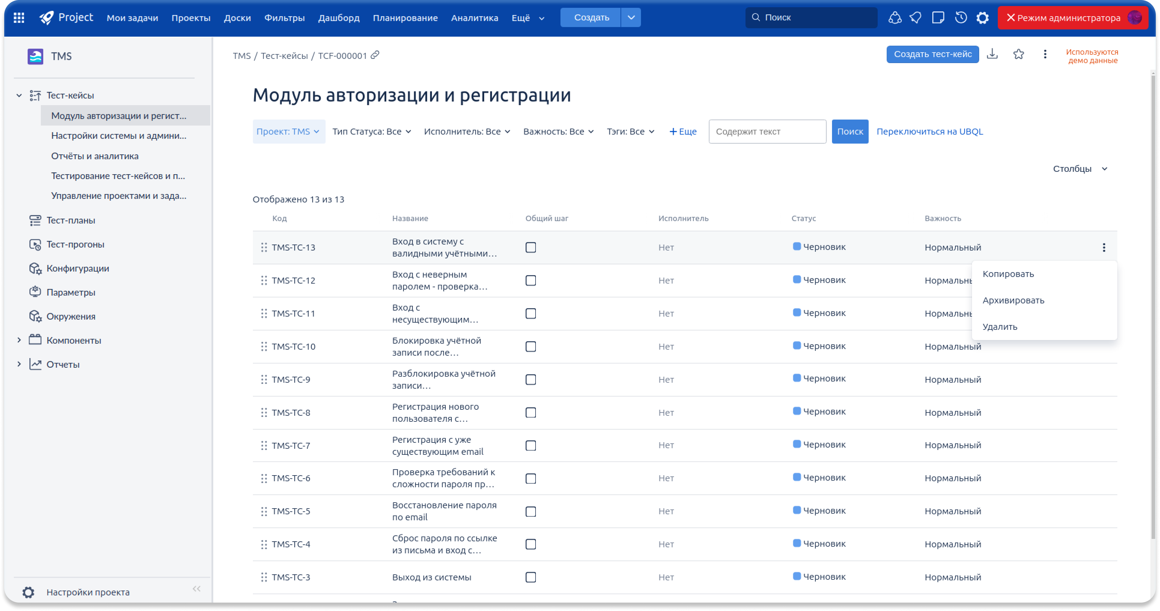Добавлены контекстные действия в списке тест-кейсов: теперь можно архивировать, клонировать и выполнять другие операции прямо из списка, без перехода в карточку объекта. Это ускоряет работу с большими наборами кейсов.