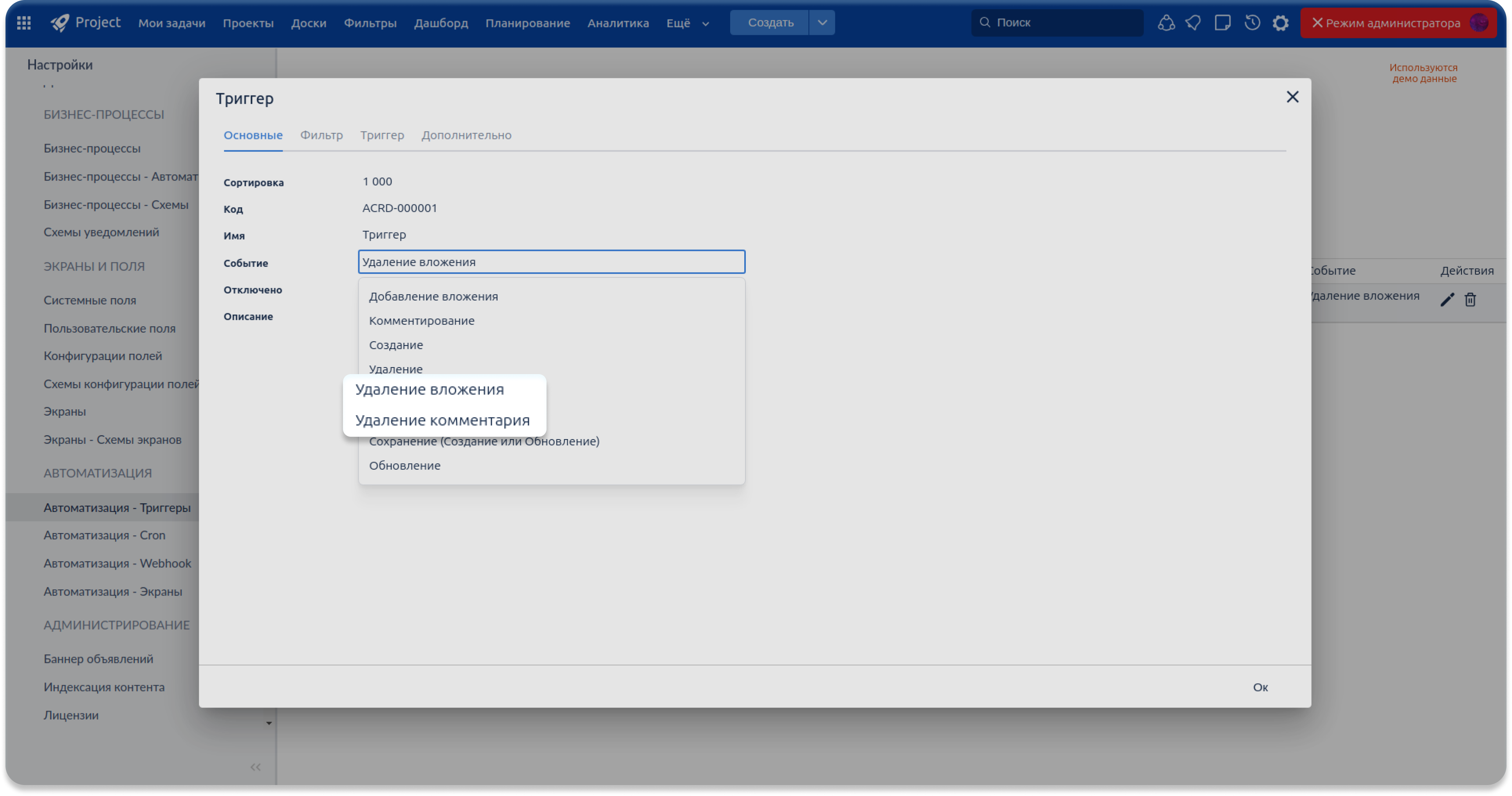 Расширены возможности настройки триггеров: в системе появились новые события, связанные с работой с вложениями и комментариями, включая событие «Удаление вложения». События обрабатываются на уровне основного объекта (задачи, документа и т.д.), что позволяет строить более точные и стабильные автоматизации без сложных обходных решений. Это упрощает настройку бизнес-правил, повышает предсказуемость сценариев и делает автоматизацию процессов ещё более гибкой.