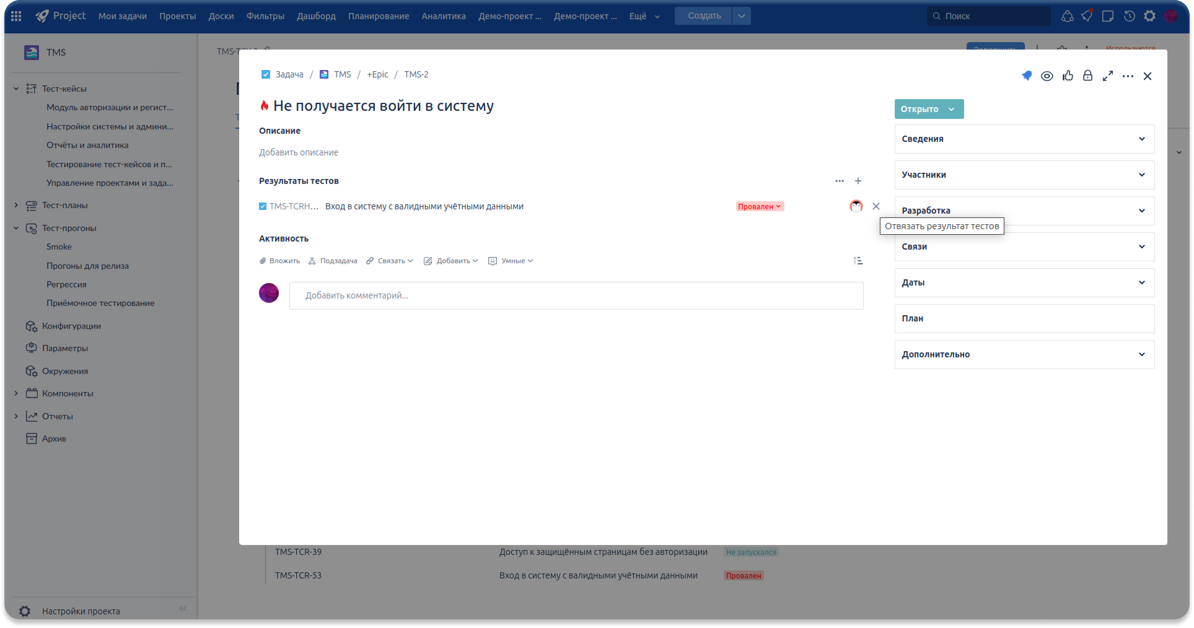 Теперь задачу, созданную из шага тест-кейса или результата прогона, можно не только привязать, но и при необходимости отвязать обратно. Это делает работу с дефектами более гибкой и позволяет поддерживать актуальные связи между тестированием и разработкой.