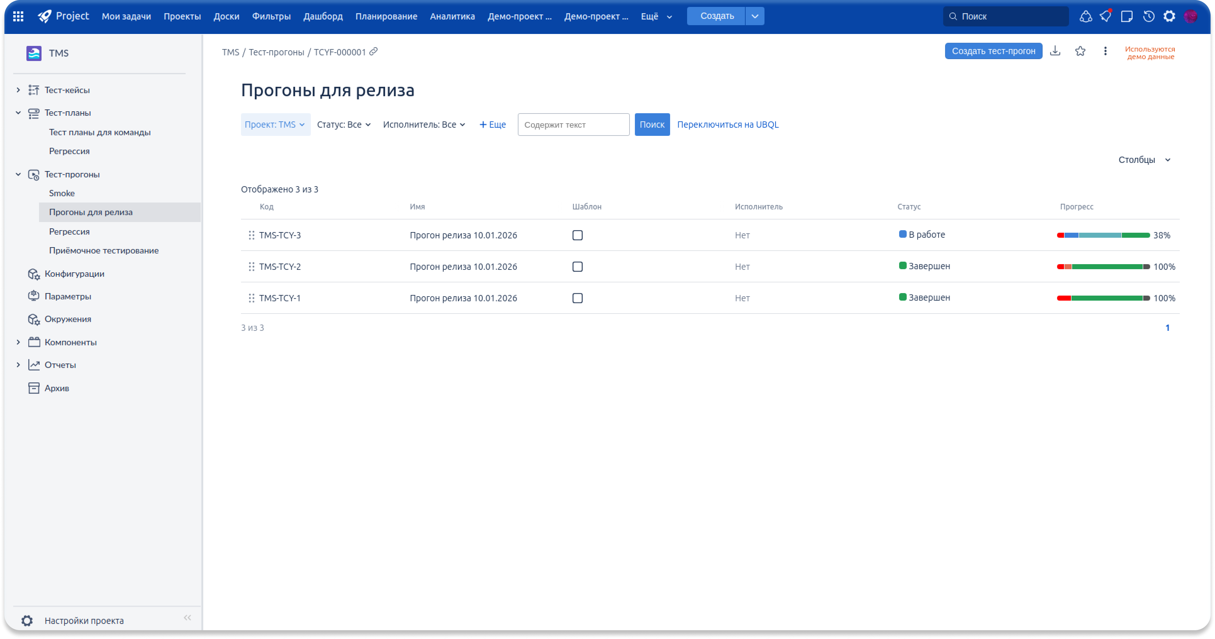 В тест-прогонах появилось отображение прогресс-бара текущего состояния выполнения. Теперь в списке прогонов сразу видно, на каком этапе находится каждый запуск и какая часть тестов уже выполнена. Это упрощает контроль тестирования, повышает прозрачность и позволяет быстрее принимать решения по качеству релиза.