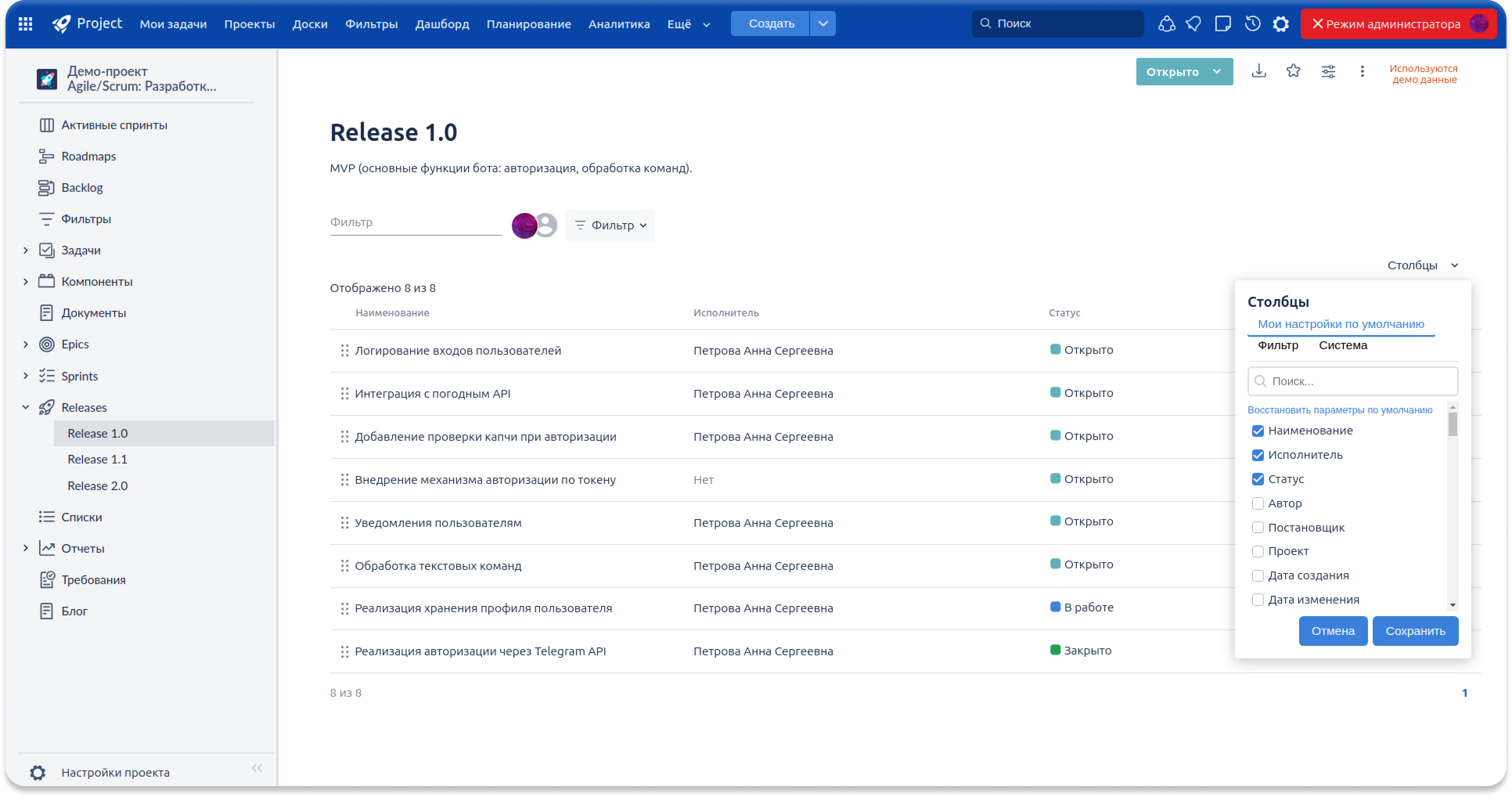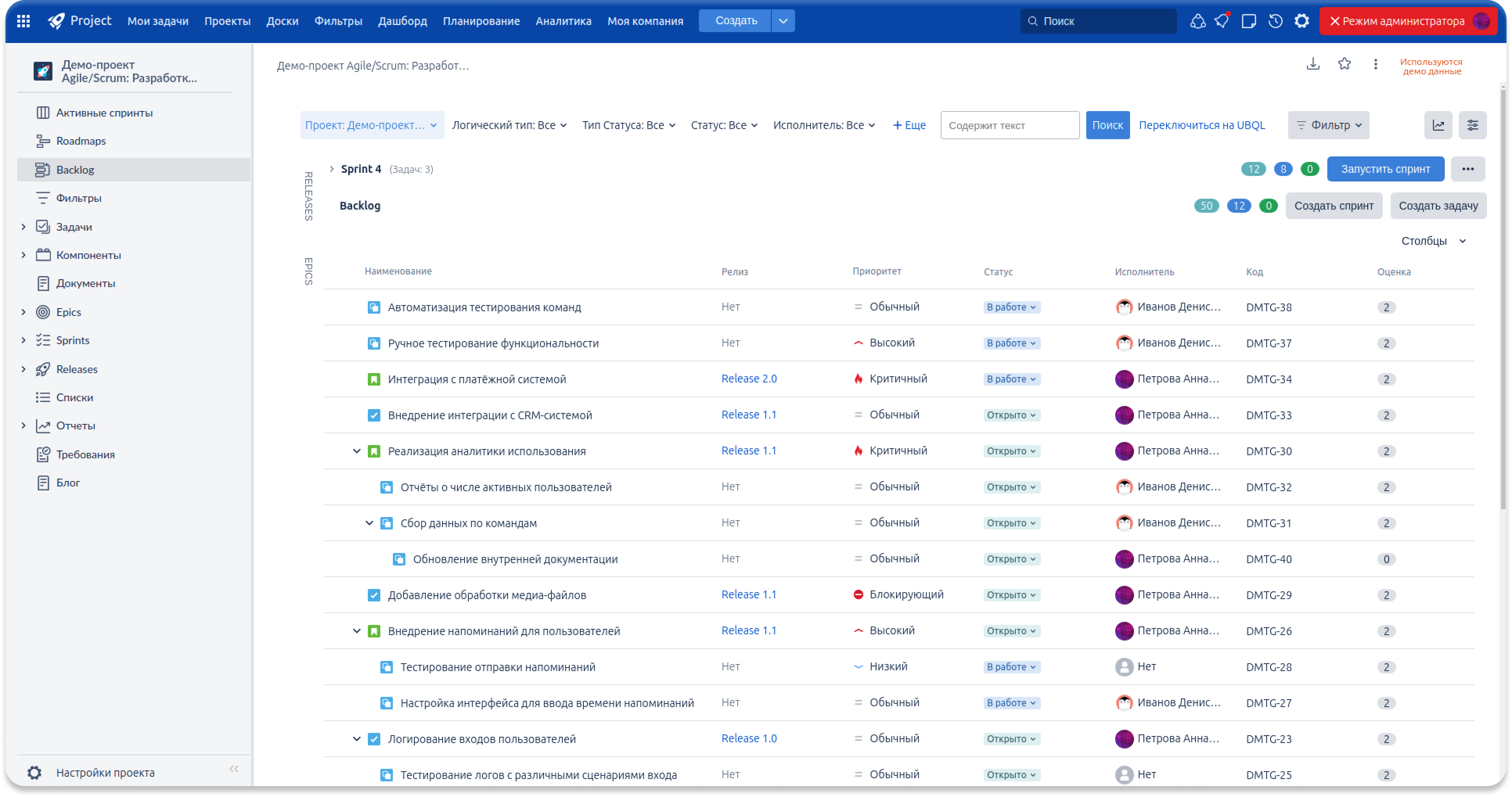 Мы полностью переработали представление бэклога и его таблицу. Теперь задачи отображаются в виде наглядной иерархии с чёткой связью родительских и дочерних элементов, что упрощает планирование и понимание структуры проекта. Пользователь сам выбирает, какие атрибуты задач выводить в бэклоге — включая любые кастомные поля — и может менять ширину колонок под свои сценарии. Обновлённая таблица работает быстрее, поддерживает сортировку по всем системным и пользовательским полям, а механизмы перемещения задач стали более точными и предсказуемыми. Бэклог превратился в гибкий и мощный инструмент управления структурой проекта.
