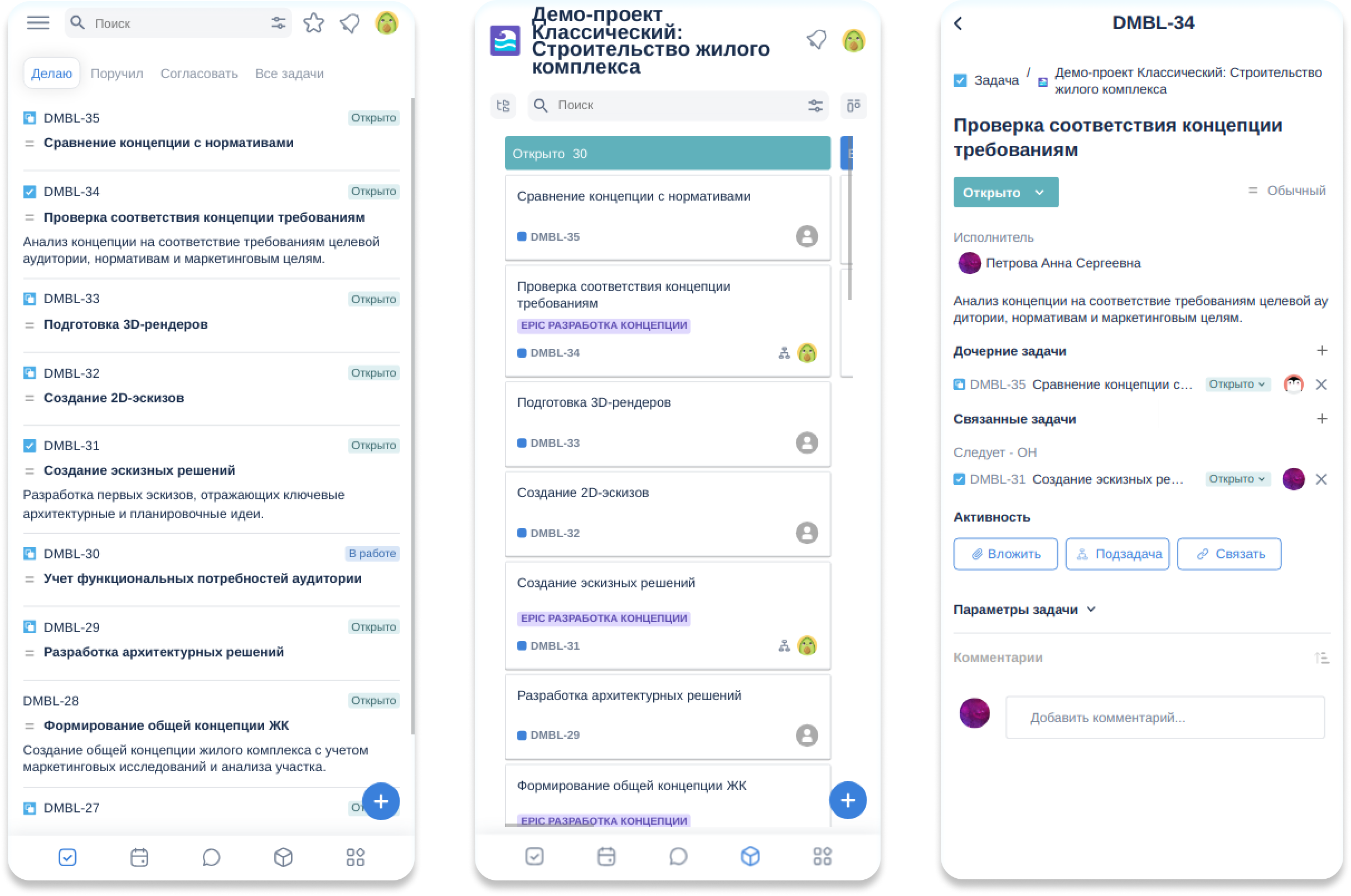 Переработана мобильная версия системы с фокусом на удобство, скорость и единый пользовательский опыт. Интерфейс стал более современным и последовательным, навигация — проще и понятнее, а ключевые сценарии работы — доступнее с мобильных устройств. В результате работать с задачами, документами и проектами со смартфона стало заметно комфортнее и приятнее.