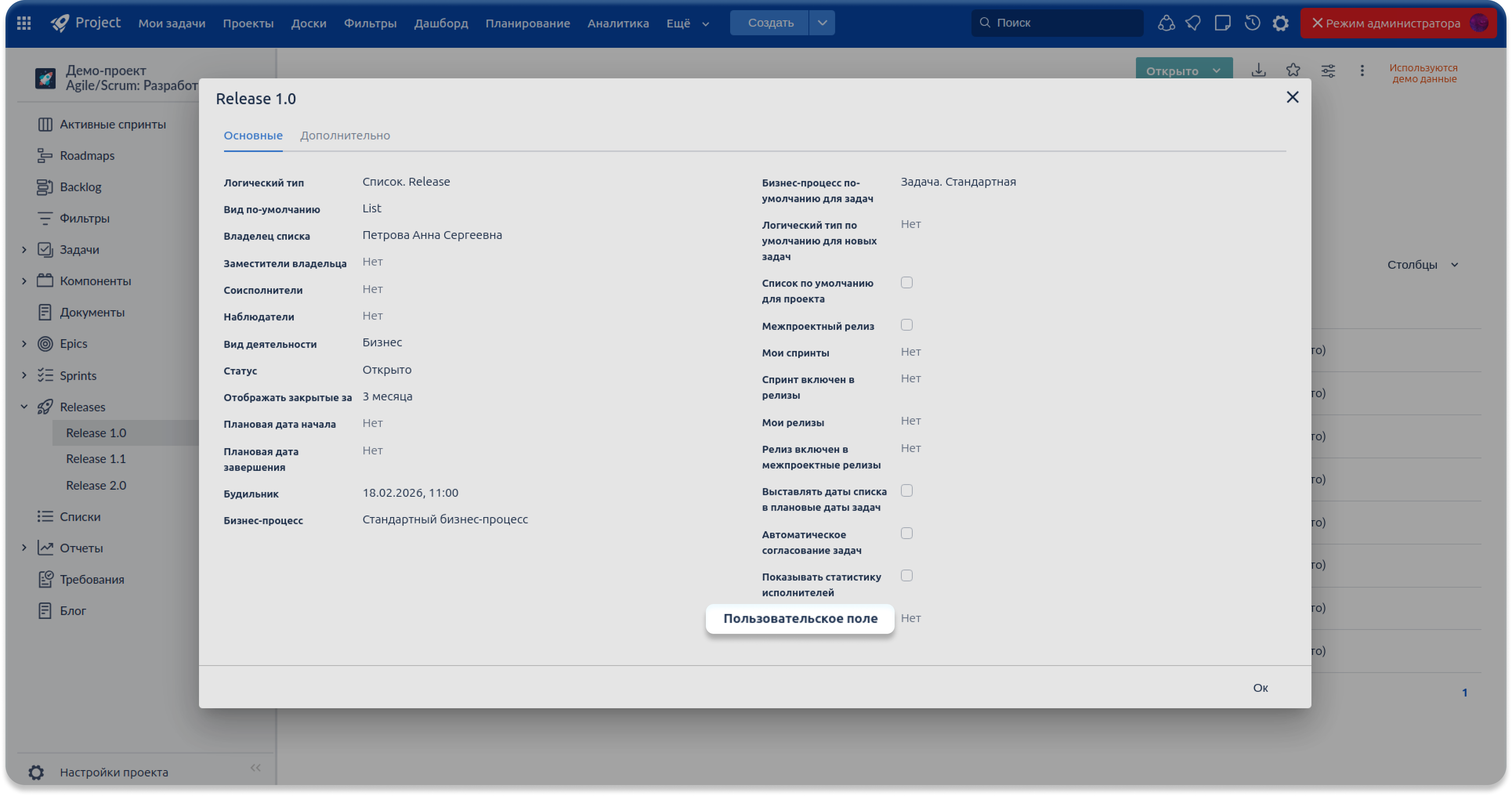Добавлена возможность выводить кастомные поля в экран настроек релизов. Теперь можно расширять карточку релиза дополнительными атрибутами, например, указывать квартал планируемого выхода или другие бизнес-параметры. Это упрощает планирование, повышает прозрачность релизного цикла и позволяет адаптировать управление релизами под процессы конкретной команды или компании.
